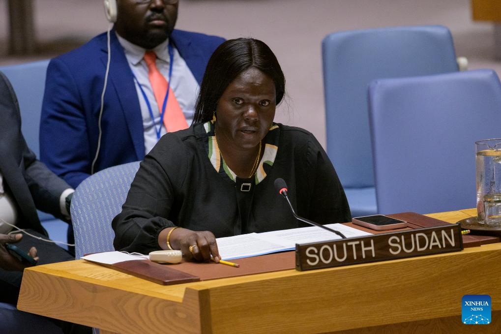 South Sudan's UN ambassador Cecilia Adeng (front) speaks at a Security Council meeting at the UN headquarters in New York, on May 30, 2025. The Security Council on Friday adopted a resolution to renew for a year, until May 31, 2026, an arms embargo against South Sudan as well as targeted sanctions of travel ban and asset freeze against individuals and entities. (Manuel Elias/UN Photo/Handout via Xinhua)