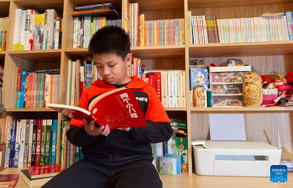 This undated photo provided by interviewee shows Zhang Shucheng, a 10-year-old student, reading a book at his home in Lanzhou, northwest China's Gansu Province. (Xinhua)