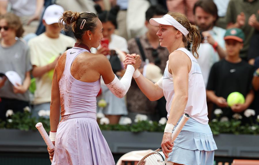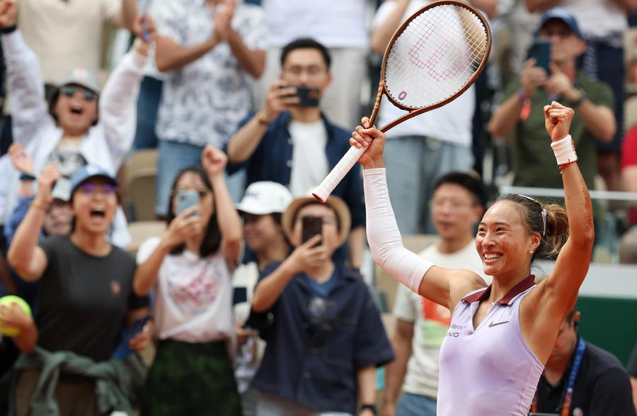 PARIS, June 1 (Xinhua) -- Less than a year after her historic Olympic triumph on the Paris clay, Chinese sensation Zheng Qinwen recorded her best result at the French Open, reaching the quarterfinals with a 7-6 (5), 1-6, 6-3 victory over Russia's Liudmila Samsonova on Sunday.