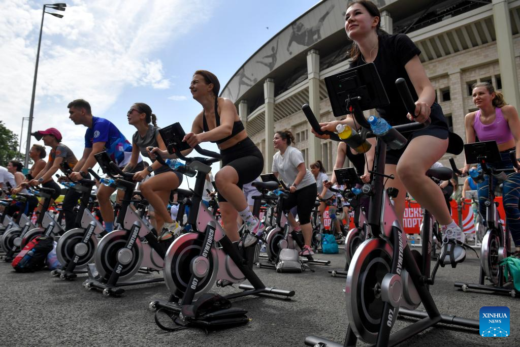 People work out on exercise bikes during Moscow Sports Day in Moscow, Russia, on May 31, 2025. (Photo by Alexander Zemlianichenko Jr/Xinhua)