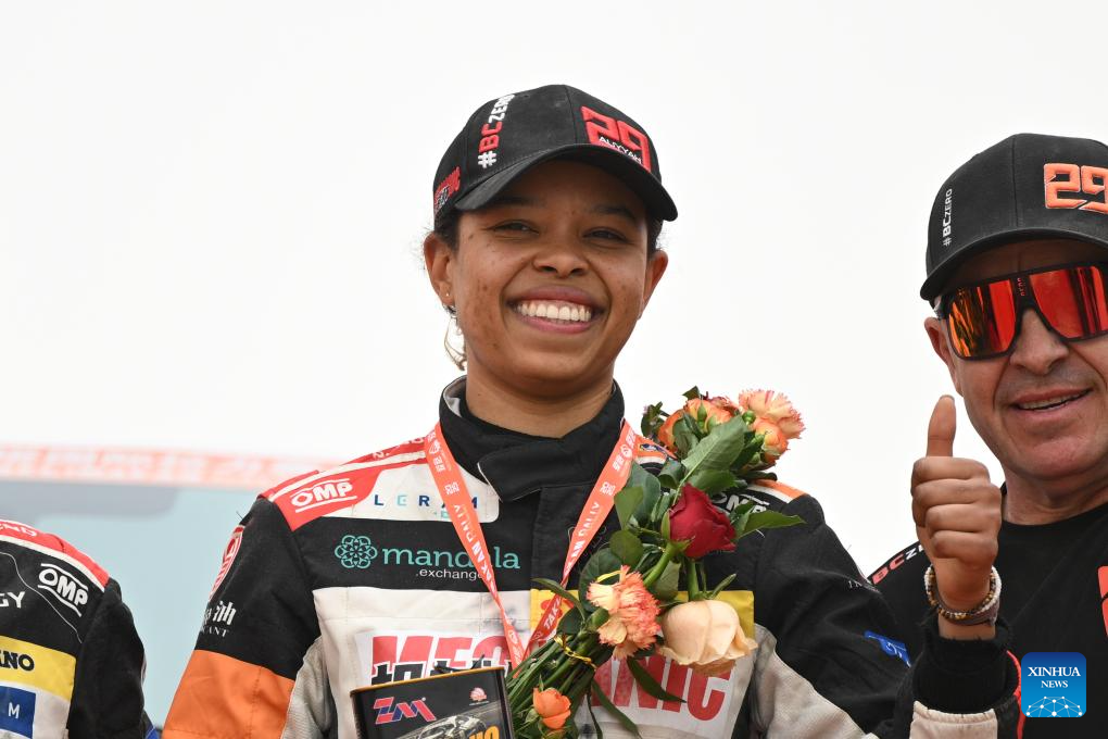 Driver Aliyyah Koloc (L) of Seychelles gestures after Stage 10 of the 2025 Taklimakan Rally in Kashgar, northwest China's Xinjiang Uygur Autonomous Region, June 1, 2025. (Xinhua/Xin Yuewei)