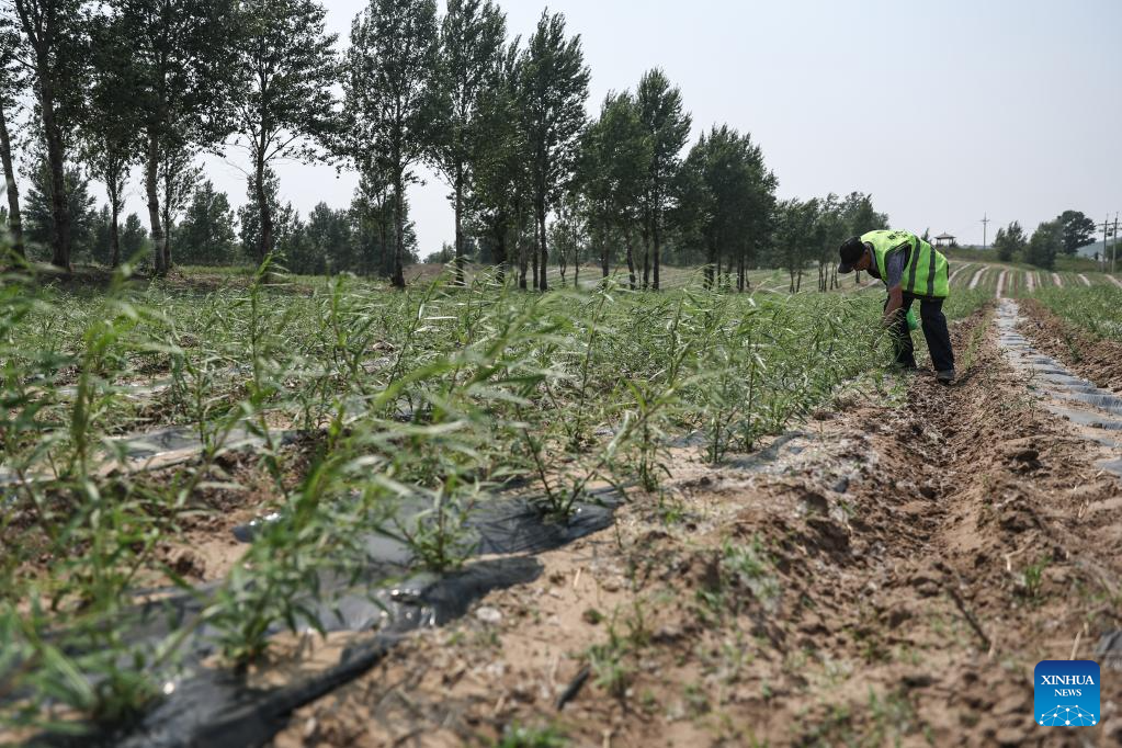 A villager checks the growth of a basket willow tree of a willow-silkworm cultivation project in sandy field in Dade Township of Zhangwu County in Fuxin, northeast China's Liaoning Province, May 29, 2025. Located on the southern edge of the Horqin sandy land, Zhangwu County was once plagued by sand and dust storms. For more than 70 years, people here have made unremitting efforts in transforming the ecological environment of this area to win the tough battle against desertification. The forest coverage rate of Zhangwu has increased from 2.9 percent to more than 30 percent, while the number of dusty days per year has fallen to single digits.