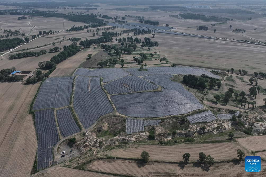 An aerial drone photo taken on May 29, 2025 shows a photovoltaic and sand-control project in Zhanggutai Township of Zhangwu County in Fuxin, northeast China's Liaoning Province. Located on the southern edge of the Horqin sandy land, Zhangwu County was once plagued by sand and dust storms. For more than 70 years, people here have made unremitting efforts in transforming the ecological environment of this area to win the tough battle against desertification. The forest coverage rate of Zhangwu has increased from 2.9 percent to more than 30 percent, while the number of dusty days per year has fallen to single digits.