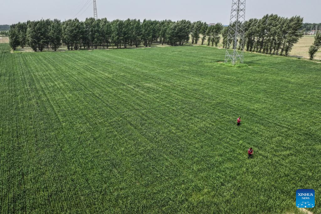 An aerial drone photo taken on May 29, 2025 shows villagers maintaining irrigation device at a wheat and soybean rotation planting field in Xinglongshan Township of Zhangwu County in Fuxin, northeast China's Liaoning Province. Located on the southern edge of the Horqin sandy land, Zhangwu County was once plagued by sand and dust storms. For more than 70 years, people here have made unremitting efforts in transforming the ecological environment of this area to win the tough battle against desertification. The forest coverage rate of Zhangwu has increased from 2.9 percent to more than 30 percent, while the number of dusty days per year has fallen to single digits.