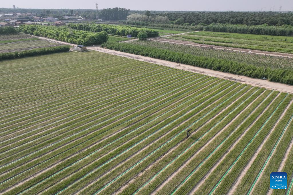 An aerial drone photo taken on May 30, 2025 shows a wild jujube plantation project in Wufeng Township of Zhangwu County in Fuxin, northeast China's Liaoning Province. Located on the southern edge of the Horqin sandy land, Zhangwu County was once plagued by sand and dust storms. For more than 70 years, people here have made unremitting efforts in transforming the ecological environment of this area to win the tough battle against desertification. The forest coverage rate of Zhangwu has increased from 2.9 percent to more than 30 percent, while the number of dusty days per year has fallen to single digits.