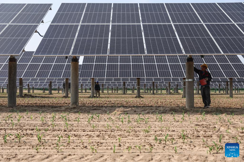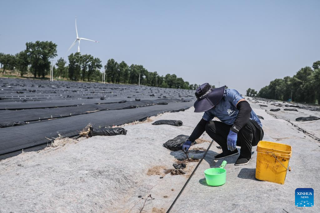 A staff member maintains photovoltaic panels at a photovoltaic and sand-control project in Zhanggutai Township of Zhangwu County in Fuxin, northeast China's Liaoning Province, May 29, 2025. Located on the southern edge of the Horqin sandy land, Zhangwu County was once plagued by sand and dust storms. For more than 70 years, people here have made unremitting efforts in transforming the ecological environment of this area to win the tough battle against desertification. The forest coverage rate of Zhangwu has increased from 2.9 percent to more than 30 percent, while the number of dusty days per year has fallen to single digits.