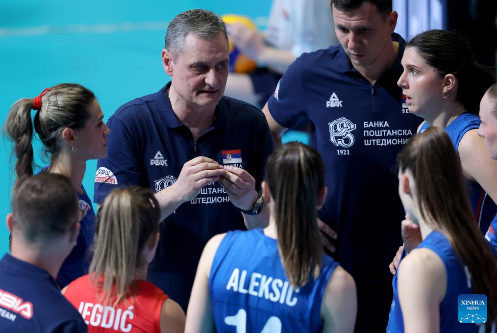Serbia's head coach Zoran Terzic (C) speaks with players during a friendly volleyball match between Serbia and Russia, in Belgrade, Serbia on May 31, 2025. (Photo by Predrag Milosavljevic/Xinhua)