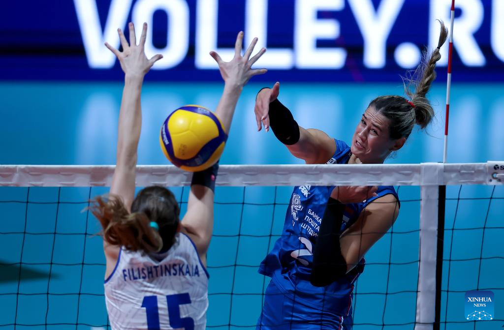 Russia's Marina Markova (R) spikes the ball during a friendly volleyball match between Serbia and Russia, in Belgrade, Serbia on May 31, 2025. (Photo by Predrag Milosavljevic/Xinhua)