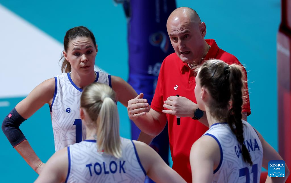 Russia's head coach Konstantin Ushakov (2nd R) speaks with players during a friendly volleyball match between Serbia and Russia, in Belgrade, Serbia on May 31, 2025. (Photo by Predrag Milosavljevic/Xinhua)