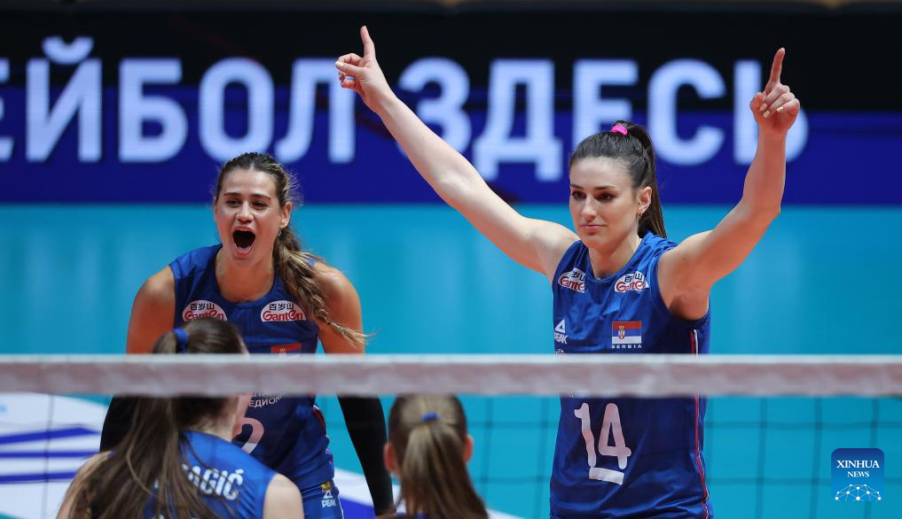Serbia's Katarina Dangubic (R) spikes the ball during a friendly volleyball match between Serbia and Russia, in Belgrade, Serbia on May 31, 2025. (Photo by Predrag Milosavljevic/Xinhua)