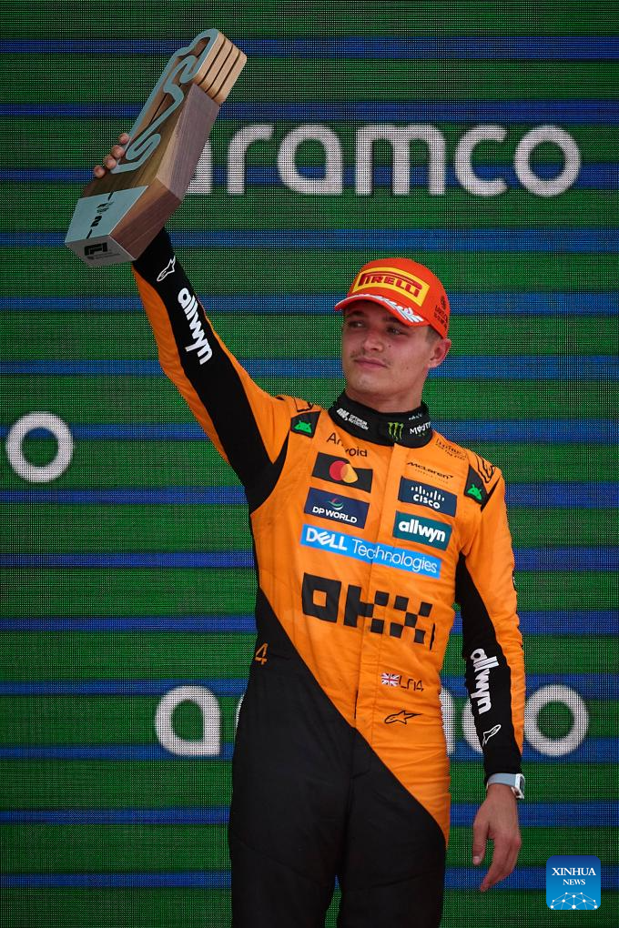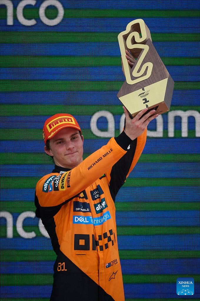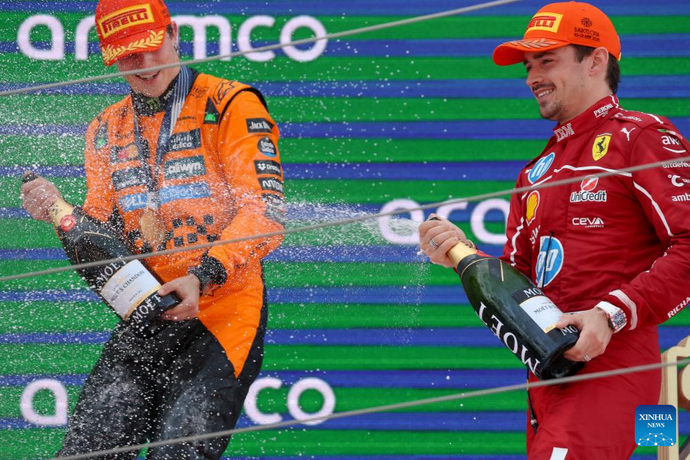 BEIJING, June 1 (Xinhua) -- Oscar Piastri claimed his fifth win of the 2025 Formula One season on Sunday, surviving a late safety car scare to lead a McLaren 1-2 at the Spanish Grand Prix, while Red Bull's Max Verstappen saw his race unravel after a late collision with Mercedes' George Russell earned him a 10-second penalty and dropped him to tenth.