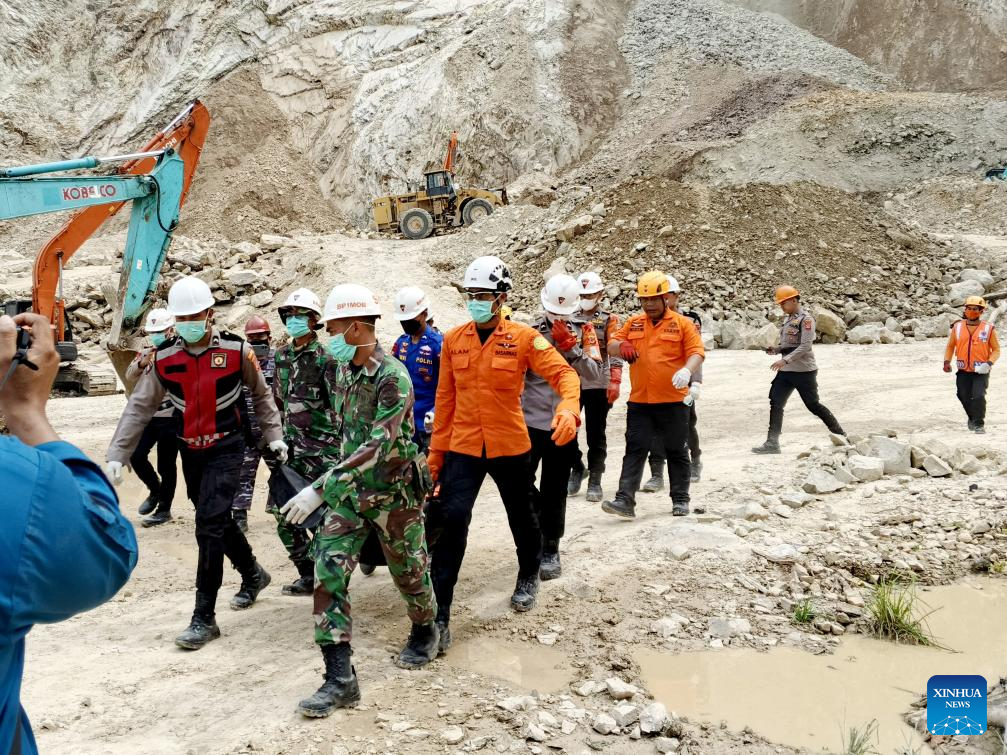 This photo provided by Indonesia's National Search and Rescue Agency (BASARNAS) shows rescuers transferring the body of a victim on the site of landslides at a quarry in Cirebon, West Java, Indonesia, June 1, 2025. The death toll of landslides at a quarry in Indonesia's West Java province on May 30 increased to 19 as of Sunday. (BASARNAS/Handout via Xinhua)