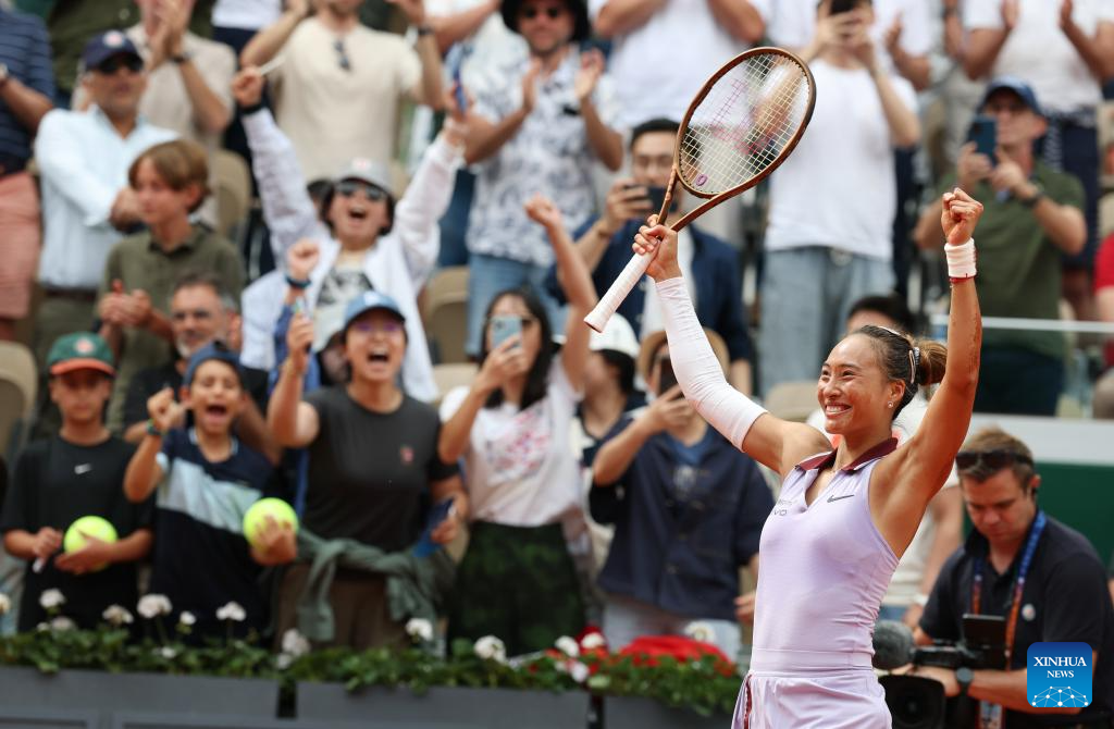Zheng Qinwen celebrates after the women's singles 4th round match between Liudmila Samsonova of Russia and Zheng Qinwen of China at the French Open tennis tournament at Roland Garros, Paris, France, June 1, 2025. (Xinhua/Gao Jing)