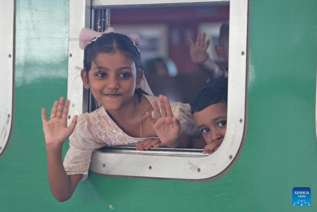 Children set off from a railway station in Dhaka, Bangladesh, May 31, 2025. As Eid al-Adha approaches, the capital has witnessed a surge of people returning home for the festival. (Photo by Habibur Rahman/Xinhua)