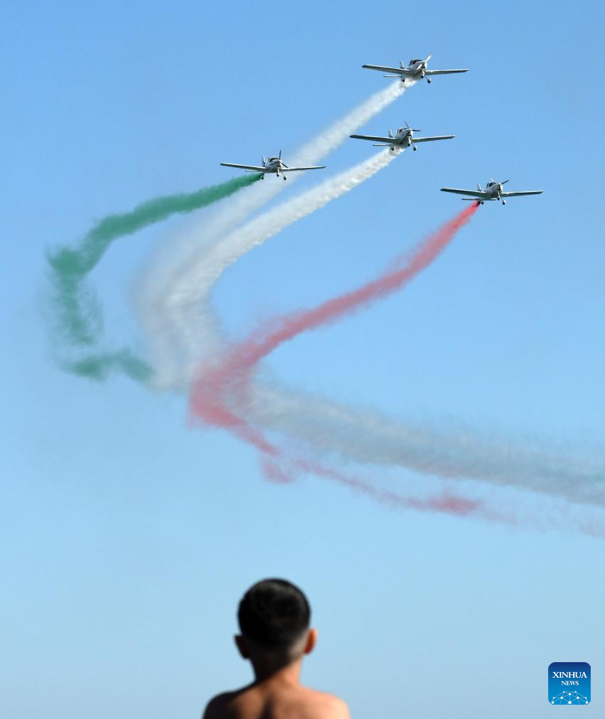 Aircraft of the Italian aerobatic squad Frecce Tricolori perform during an air show in Ladispoli, Rome, Italy, June 1, 2025. (Photo by Alberto Lingria/Xinhua)