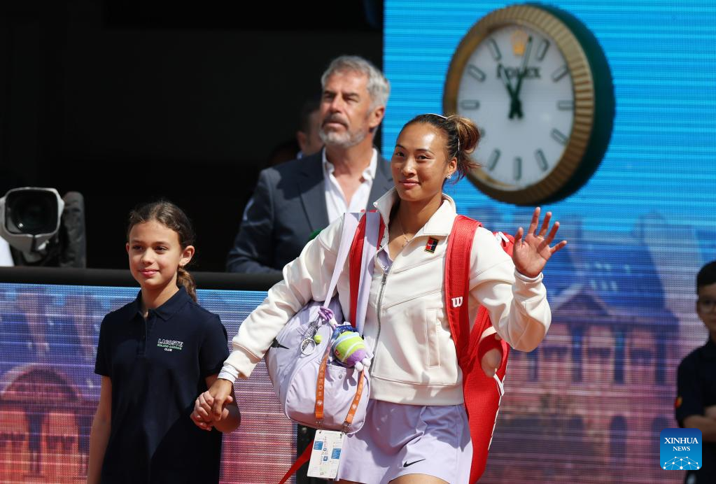 Zheng Qinwen (R) enters the court before the women's singles quarterfinal between Zheng Qinwen of China and Aryna Sabalenka of Belarus at the French Open tennis tournament at Roland Garros, Paris, France, June 3, 2025. (Xinhua/Gao Jing)