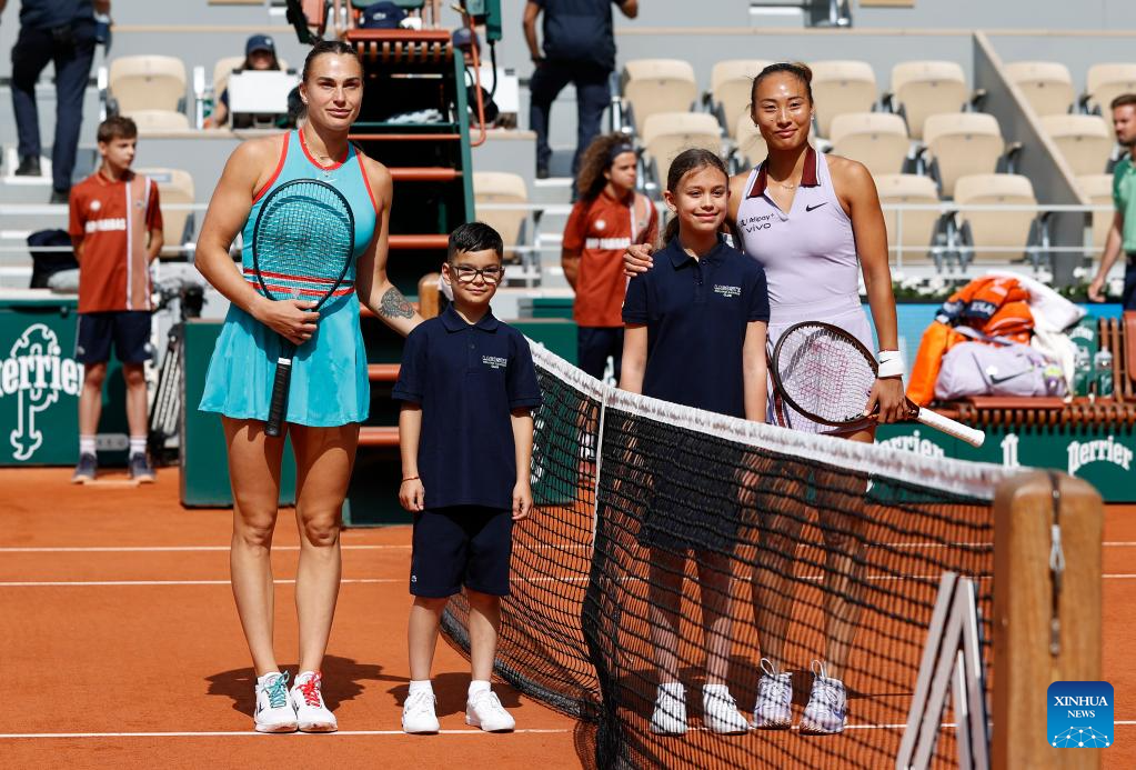 Zheng Qinwen (1st R) of China and Aryna Sabalenka (1st L) of Belarus pose for photos before the women's singles quarterfinal at the French Open tennis tournament at Roland Garros, Paris, France, June 3, 2025. (Xinhua/Gao Jing)