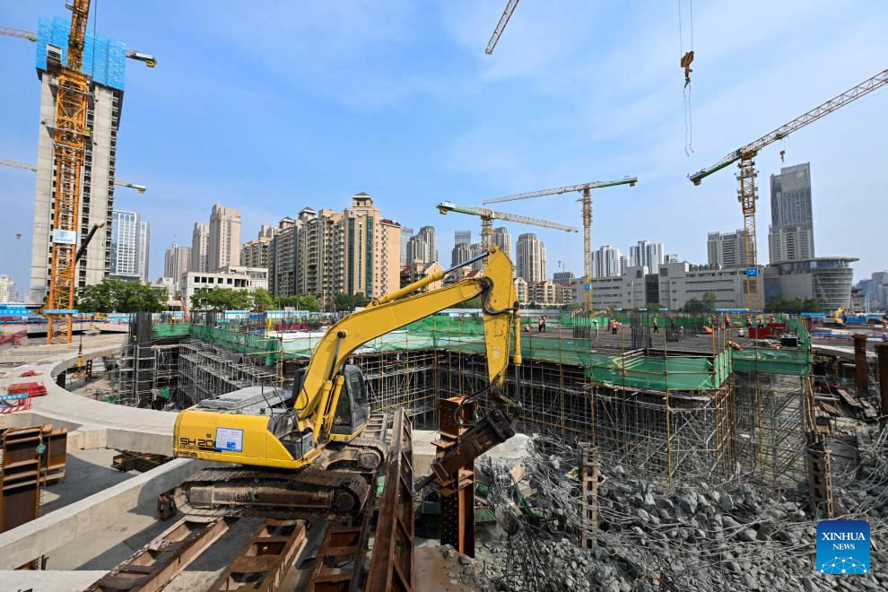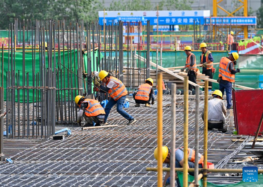 Constructors work at the construction site of an urban renewal project at Nanmenwai Street business district in north China's Tianjin on May 29, 2025. (Xinhua/Sun Fanyue)