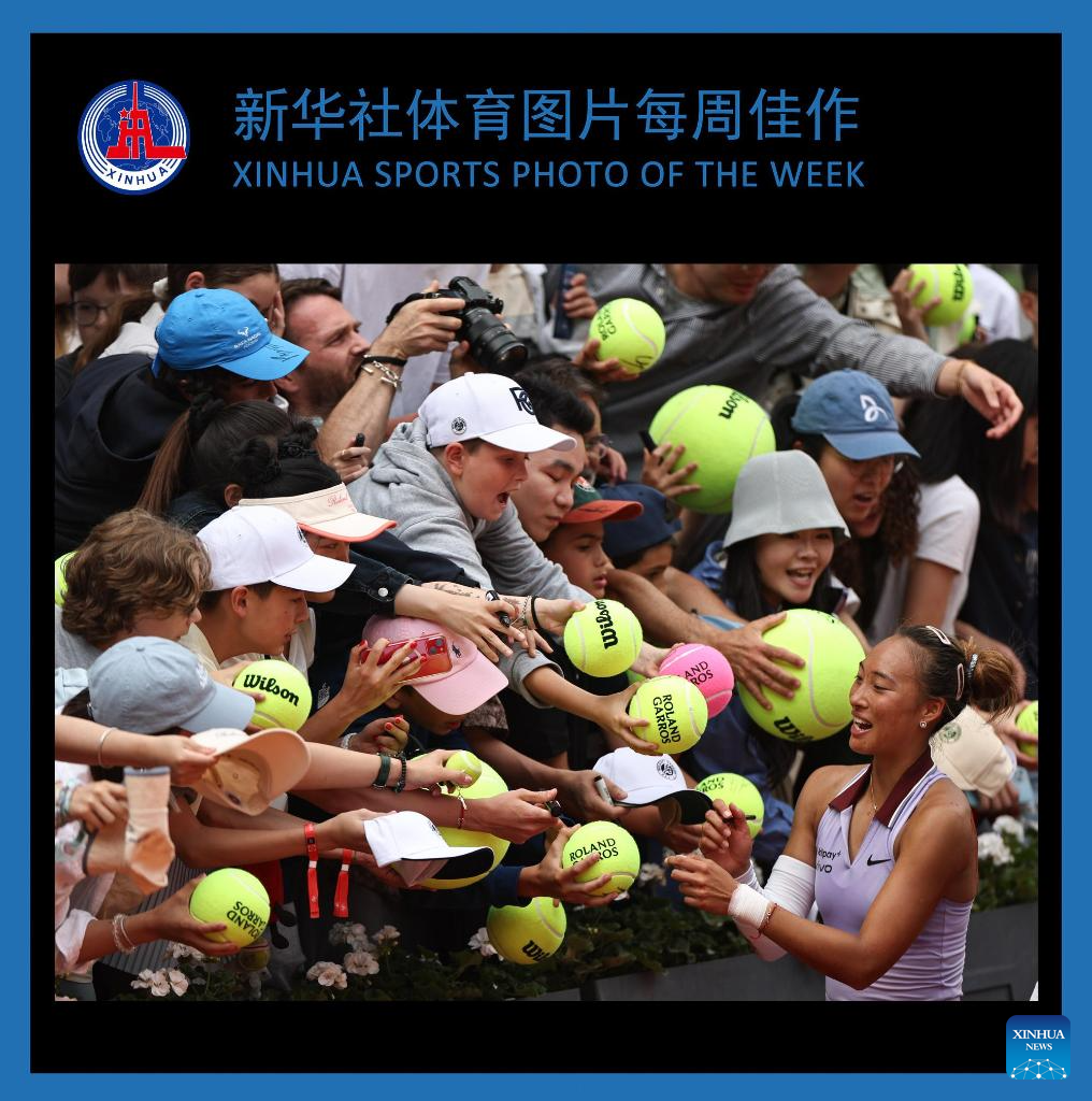 Zheng Qinwen (R) signs autographs after the women's singles 4th round match between Liudmila Samsonova of Russia and Zheng Qinwen of China at the French Open tennis tournament at Roland Garros, Paris, France, June 1, 2025. (Xinhua/Li Jing)