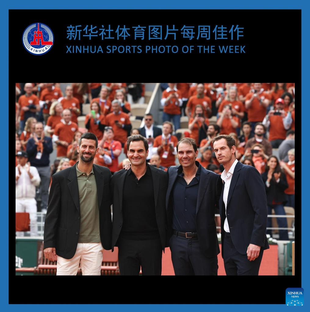 Andy Murray, Rafael Nadal, Roger Federer and Novak Djokovic (from R to L) pose for a photo during a ceremony held for former Spanish tennis player Rafael Nadal honoring his career during the French Open tennis tournament on Court Philippe Chatrier at the Roland Garros in Paris, France, May 25, 2025. (Xinhua/Li Jing)