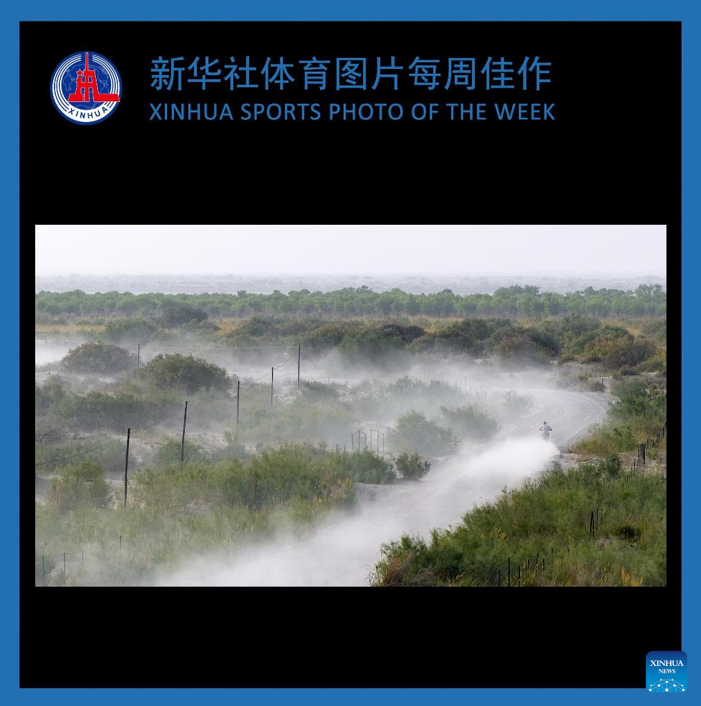 A drone photo shows a rider competing during Stage 5 of the 2025 Taklimakan Rally in Hotan, northwest China's Xinjiang Uygur Autonomous Region, May 26, 2025. (Xinhua/Hu Xingyu)