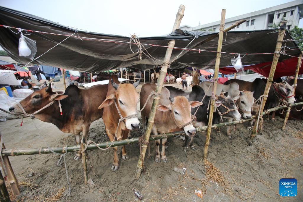 Cattle are seen at a local market in Dhaka, Bangladesh, June 2, 2025. With the Muslim festival of Eid al-Adha just around the corner, Dhaka's cattle markets stand prepared for the influx of buyers. (Photo by Habibur Rahman/Xinhua)