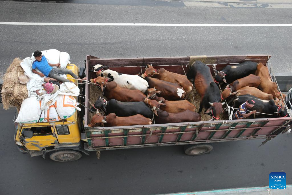 A truck transfers cattle to the local market in Dhaka, Bangladesh, June 2, 2025. With the Muslim festival of Eid al-Adha just around the corner, Dhaka's cattle markets stand prepared for the influx of buyers. (Photo by Habibur Rahman/Xinhua)