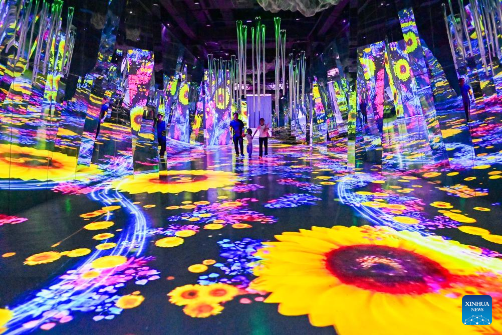 People visit a digital light show at Qingzhou ancient town scenic area in east China's Shandong Province, June 2, 2025. People enjoy the 3-day holiday of the Dragon Boat Festival, also called Duanwu Festival which falls on May 31 this year, via various activities across the country. (Photo by Wang Jilin/Xinhua)