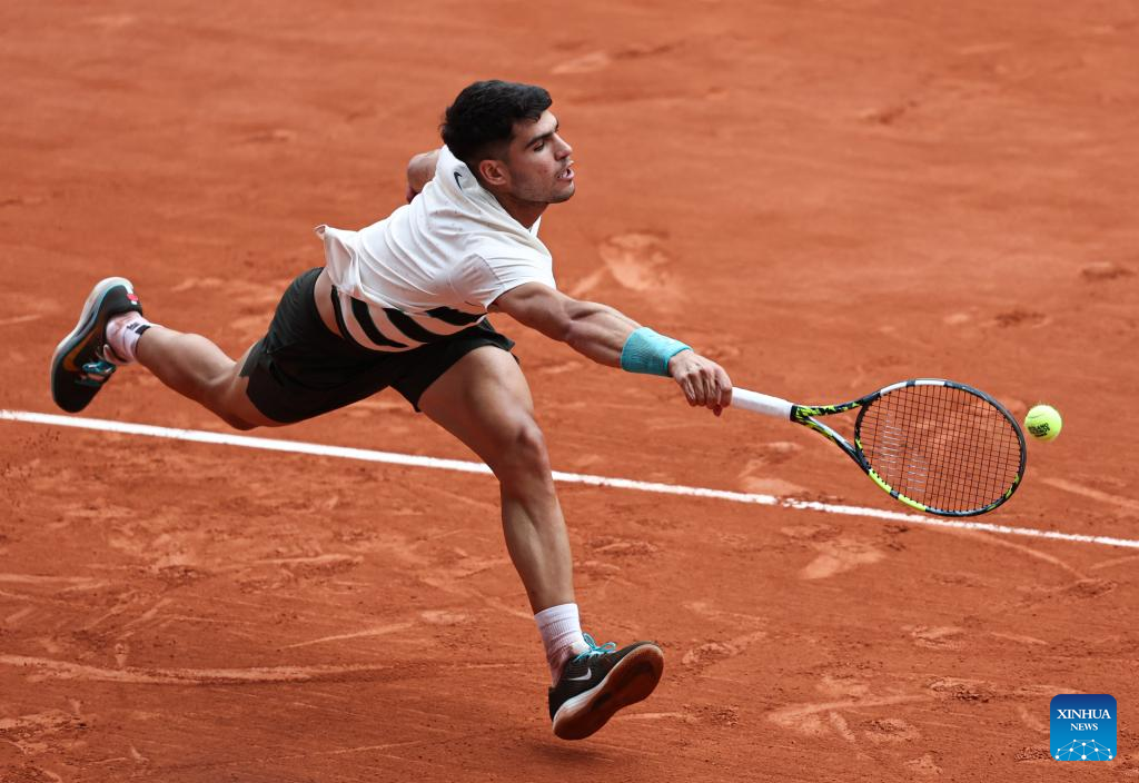 Carlos Alcaraz of Spain returns a shot during the men's singles 4th round match against Ben Shelton of the United States at the French Open tennis tournament at Roland Garros, Paris, France, June 1, 2025. (Xinhua/Li Jing)