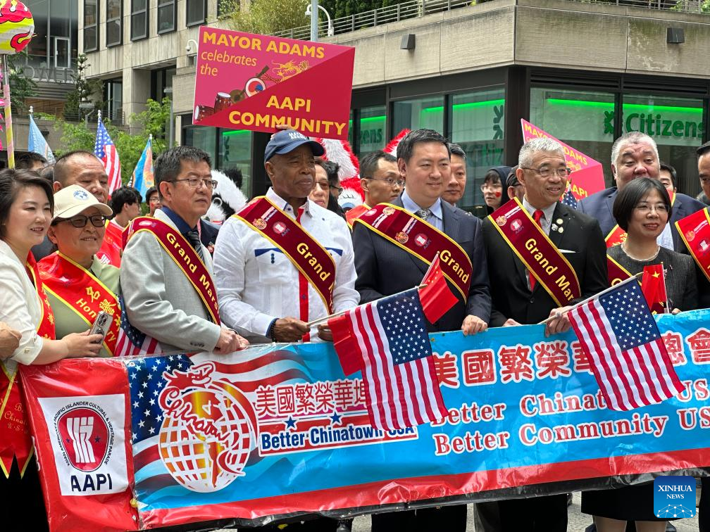 New York City Mayor Eric Adams (4th L, Front) and Chinese Consul General in New York Chen Li (5th L, Front) lead a parade in celebration of Asian American and Pacific Islander (AAPI) Heritage Month in New York, the United States, on June 1, 2025. (Photo by Qin Mingwei/Xinhua)