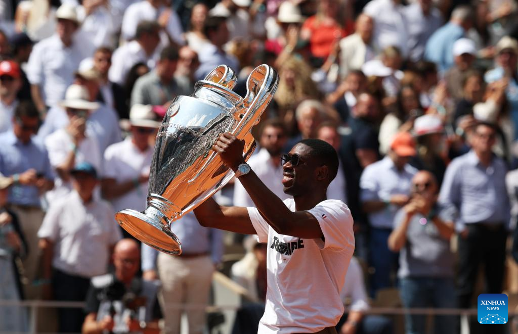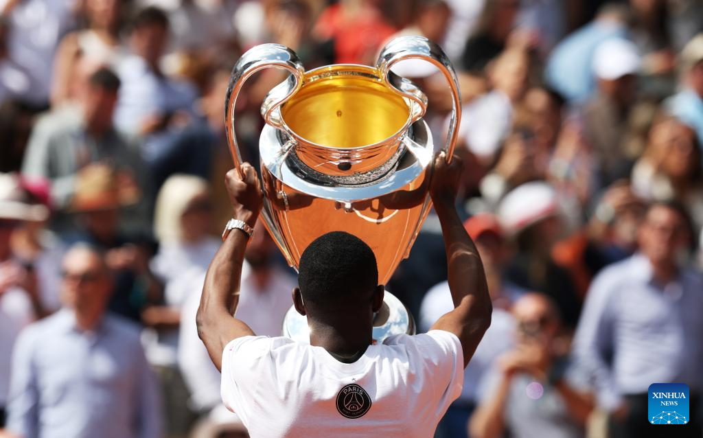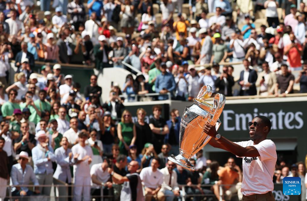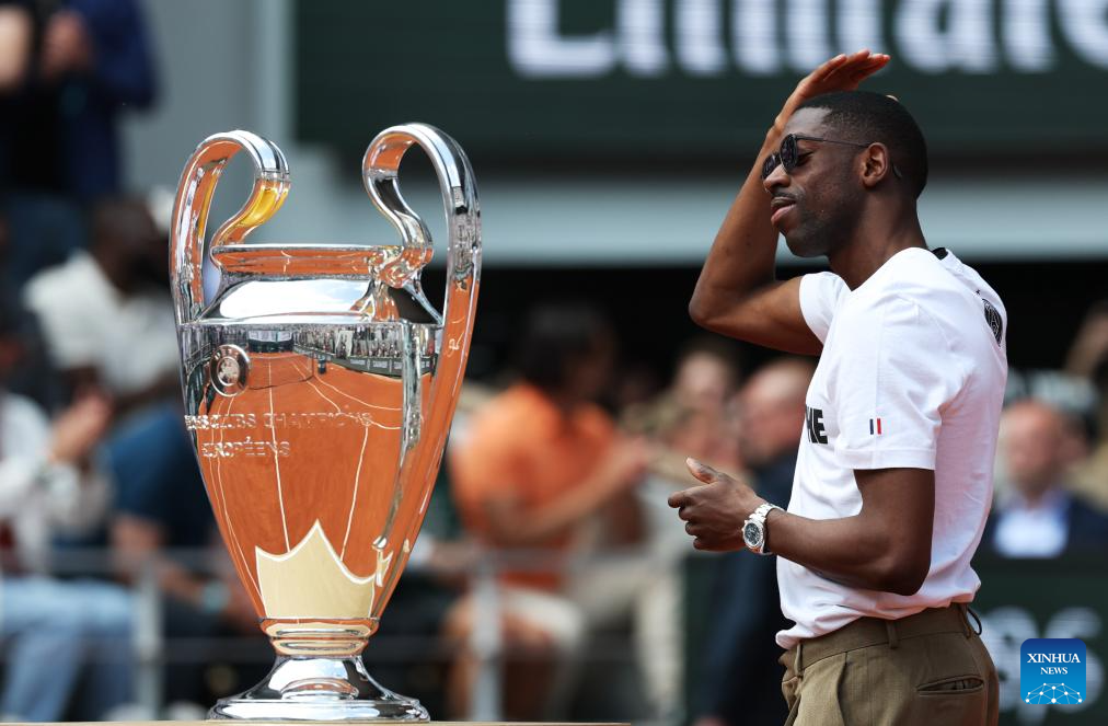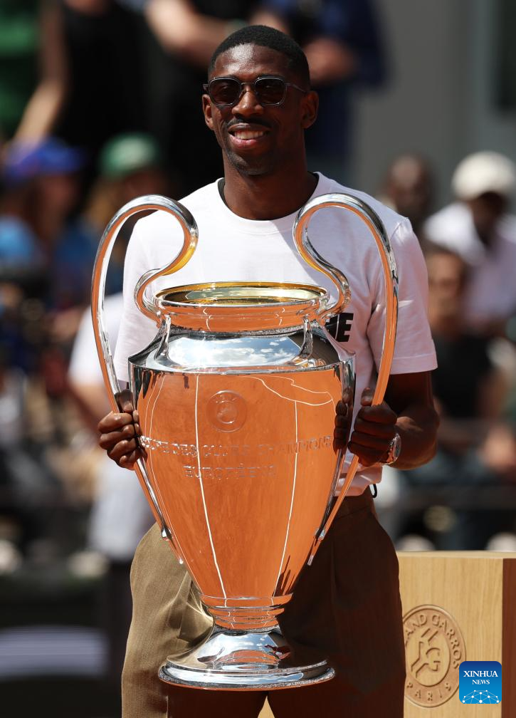 Paris Saint-Germain's French forward Ousmane Dembele presents the UEFA Champions League's trophy on Court Philippe Chatrier at the French Open tennis tournament at Roland Garros, Paris, France, June 2, 2025. (Xinhua/Gao Jing)