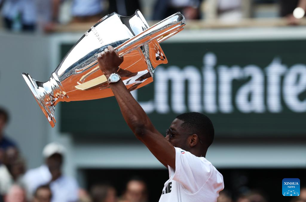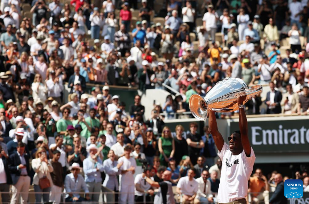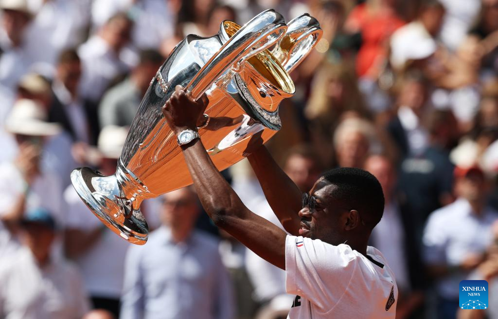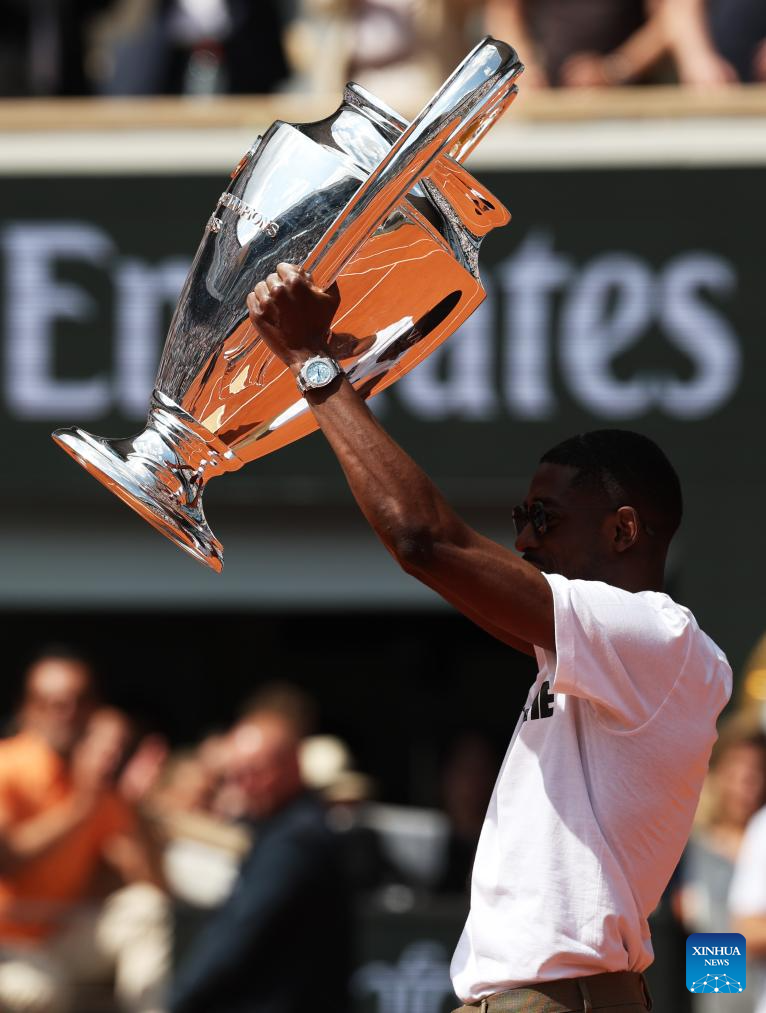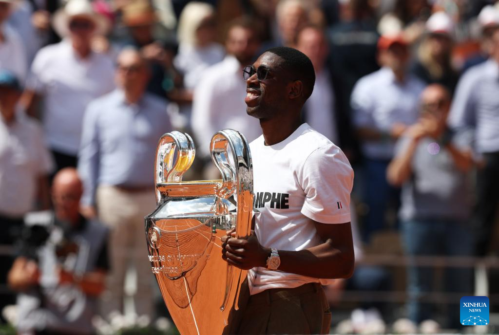 Paris Saint-Germain's French forward Ousmane Dembele presents the UEFA Champions League's trophy on Court Philippe Chatrier at the French Open tennis tournament at Roland Garros, Paris, France, June 2, 2025. (Xinhua/Gao Jing)