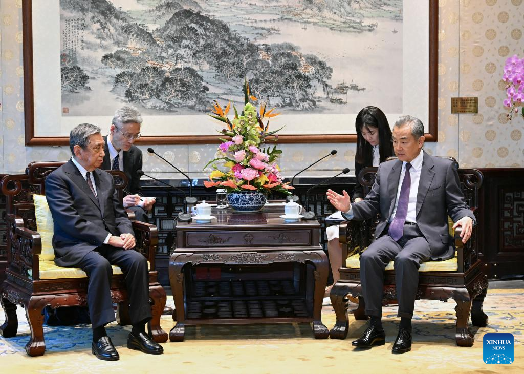 Wang Yi, a member of the Political Bureau of the Communist Party of China Central Committee and director of the Office of the Central Commission for Foreign Affairs, meets with Yohei Kono, president of the Japanese Association for the Promotion of International Trade (JAPIT), in Beijing, capital of China, June 4, 2025. (Xinhua/Yin Bogu)