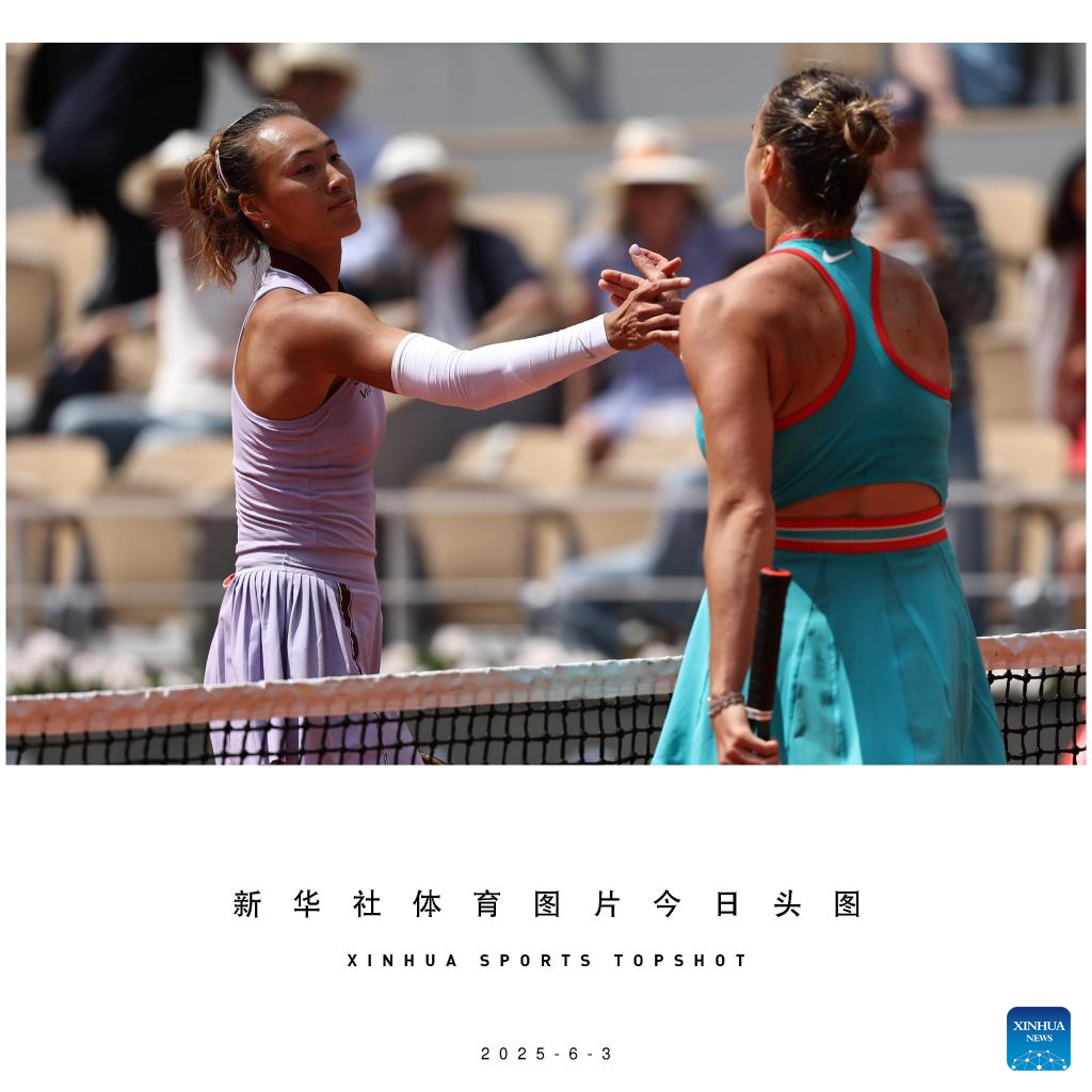 Zheng Qinwen (L) of China and Aryna Sabalenka of Belarus greet each other after the women's singles quarterfinal at the French Open tennis tournament at Roland Garros, Paris, France, June 3, 2025. (Xinhua/Li Jing)