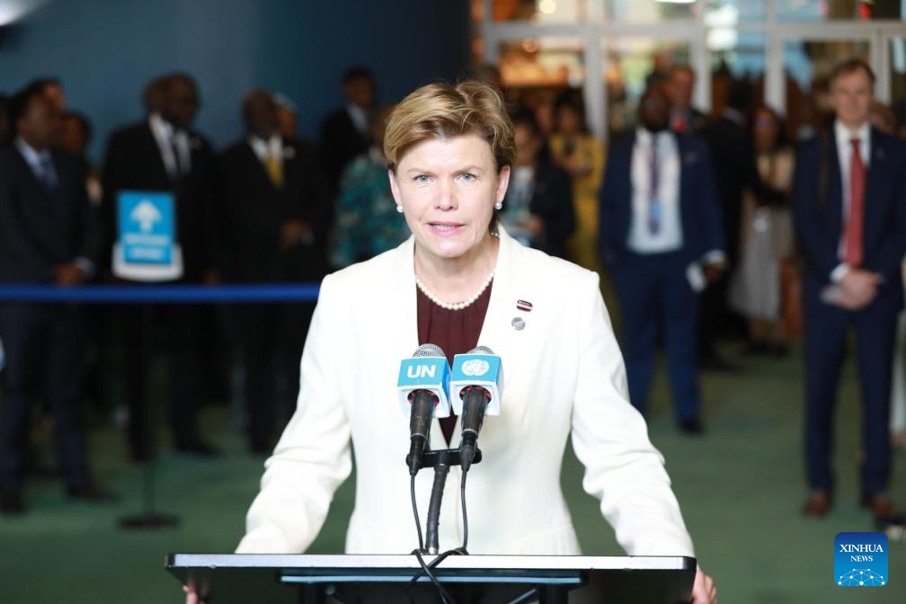 Latvian Foreign Minister Baiba Braze speaks to the press after Latvia was elected as a non-permanent member of the UN Security Council at the UN headquarters in New York, on June 3, 2025. Bahrain, Colombia, the Democratic Republic of the Congo (DRC), Latvia and Liberia were elected non-permanent members of the UN Security Council on Tuesday for a two-year term running from Jan. 1, 2026 to Dec. 31, 2027. (Xinhua/Xie E)