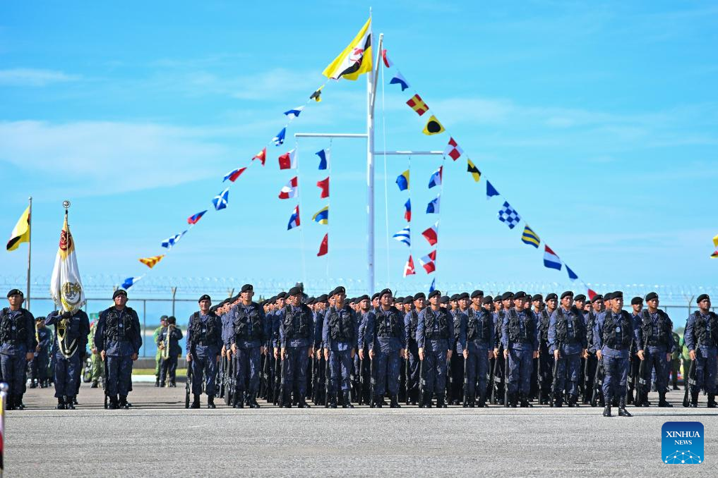Troops attend a military parade at Brunei's Muara Naval Base, on May 31, 2025. Brunei celebrated the 64th anniversary of its royal armed forces with a series of events across the nation, featuring a grand military parade, exhibitions, and school activities, local media has reported. (Information Department of Brunei's Prime Minister's Office/Handout via Xinhua)