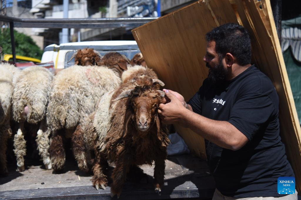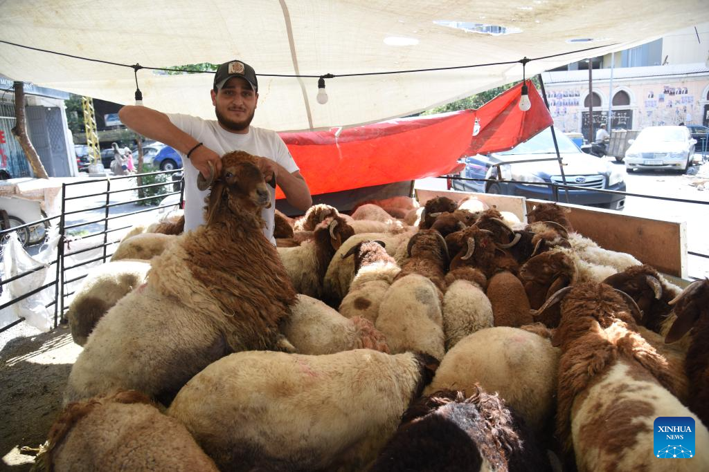 A vendor presents a sheep at a livestock market ahead of the Muslim festival of Eid al-Adha, or the Feast of Sacrifice in Tripoli, Lebanon, on June 4, 2025. (Photo by Khaled Habashiti/Xinhua)