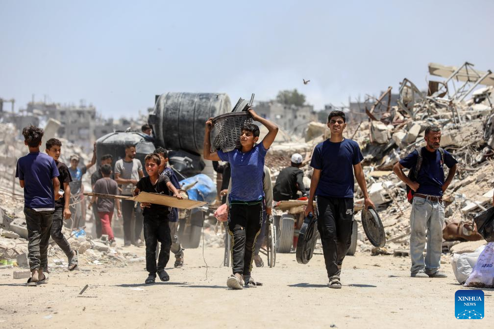 Returning Palestinians are seen in the town of Beit Lahia, northern Gaza Strip, on June 4, 2025. The Israel Defense Forces (IDF) on Wednesday night issued an urgent warning to residents of the Gaza Strip to avoid moving northward for their safety. IDF spokesman Avichay Adraee addressed Gazan residents who have returned or intend to return to Beit Lahia, Jabalia, and Beit Hanoun, all north of Gaza City, on social media X, warning that the IDF is operating in these areas with "heavy force." (Photo by Rizek Abdeljawad/Xinhua)