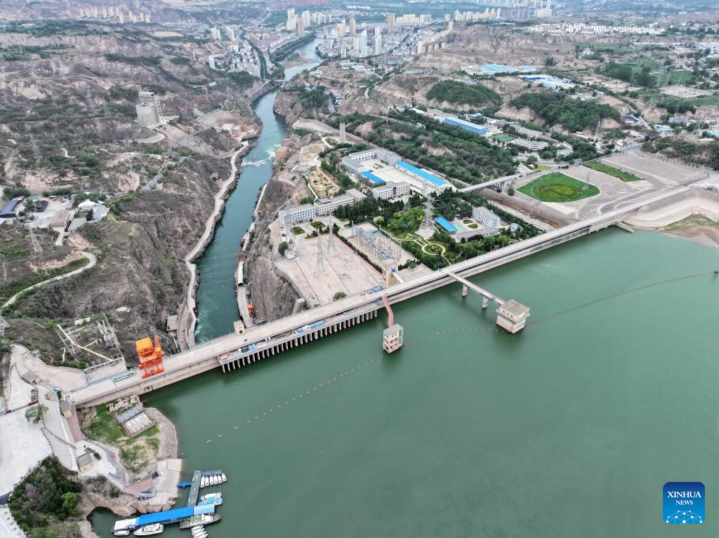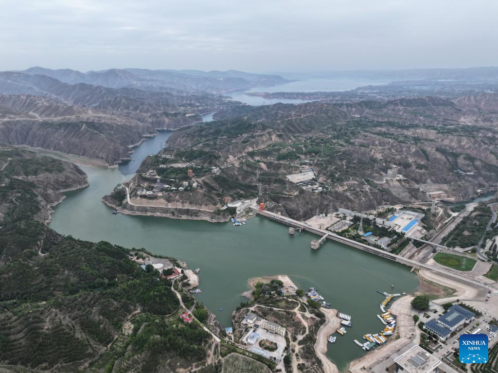 An aerial drone photo taken on June 6, 2025 shows a view of Liujiaxia Reservoir in Linxia Hui Autonomous Prefecture, northwest China's Gansu Province. Liujiaxia hydropower plant has increased the average daily outflow of Liujiaxia Reservoir from 900 cubic meters per second to 1,100 cubic meters per second from June 6 to provide a solid guarantee for drought relief, irrigation and ecological water replenishment. (Photo by Hou Qi/Xinhua)