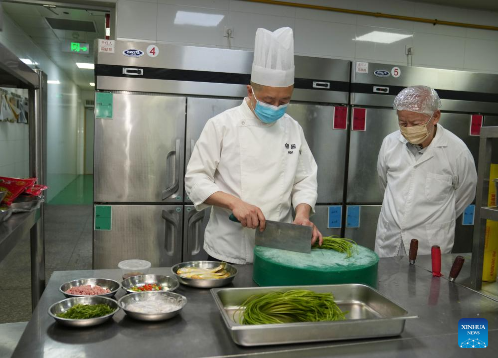 Kong Hainan (R) watches as a chef cooks a dish with ottelia acuminata at the dining hall of Shanghai Jiao Tong University in east China's Shanghai, May 29, 2025.