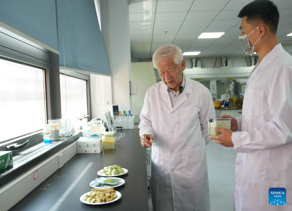 A researcher invites Kong Hainan (L) to try newly developed snacks made from ottelia acuminata at the School of Agriculture and Biology of Shanghai Jiao Tong University in east China's Shanghai, May 29, 2025. (Xinhua/Liu Ying)