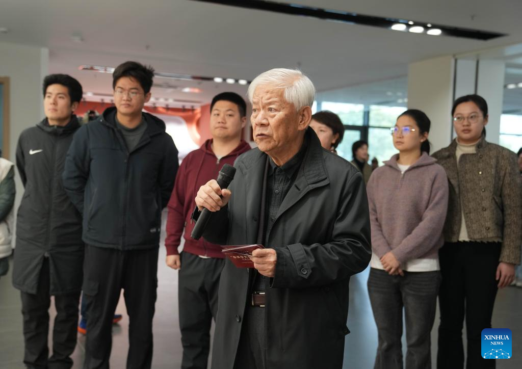 Kong Hainan (front) shares the story of ecology restoration of Erhai Lake and development of ottelia acuminata industry to freshmen at School of Environmental Science and Engineering of Shanghai Jiao Tong University in east China's Shanghai, March 14, 2025. (Xinhua/Liu Ying)