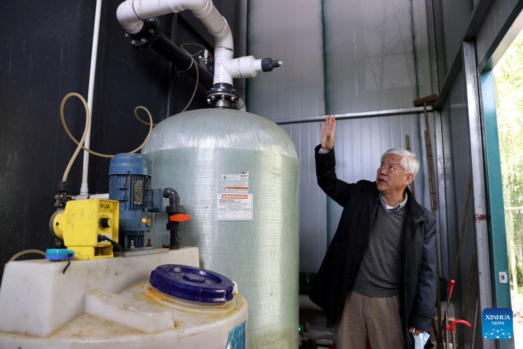 Kong Hainan introduces a miniature version of the water quality purification system at Erhai Lake on a project site in Shanghai Jiao Tong University in east China's Shanghai, April 7, 2021. (Xinhua/Liu Ying)