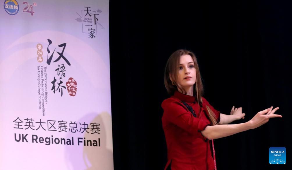 A contestant dances during the talent performance session at the UK Regional Final of the 24th "Chinese Bridge" Chinese Proficiency Competition for Foreign College Students in London, Britain, June 5, 2025. (Xinhua/Li Ying)