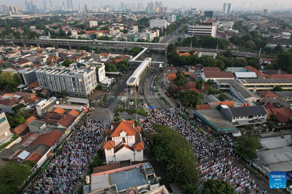 An aerial drone photo shows people performing Eid al-Adha prayer at Jatinegara in Jakarta, Indonesia on June 6, 2025. (Xinhua/Veri Sanovri)