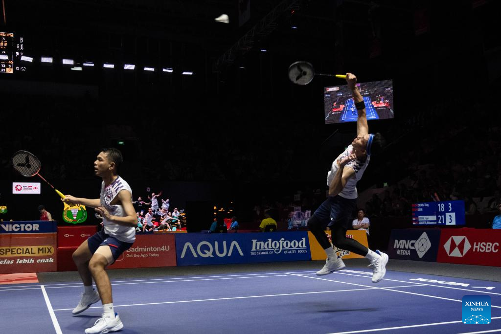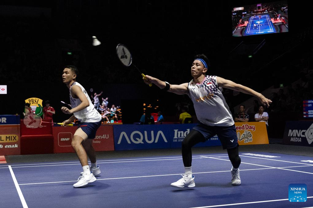 Fajar Alfian/Muhammad Rian Ardianto (L) compete during the men's doubles round of 16 match between Chen Boyang/Liu Yi of China and Fajar Alfian/Muhammad Rian Ardianto of Indonesia at Indonesia Open 2025 in Jakarta, Indonesia, June 5, 2025. (Xinhua/Veri Sanovri)