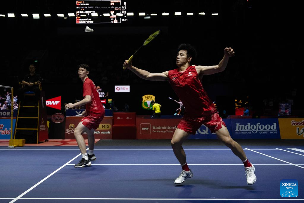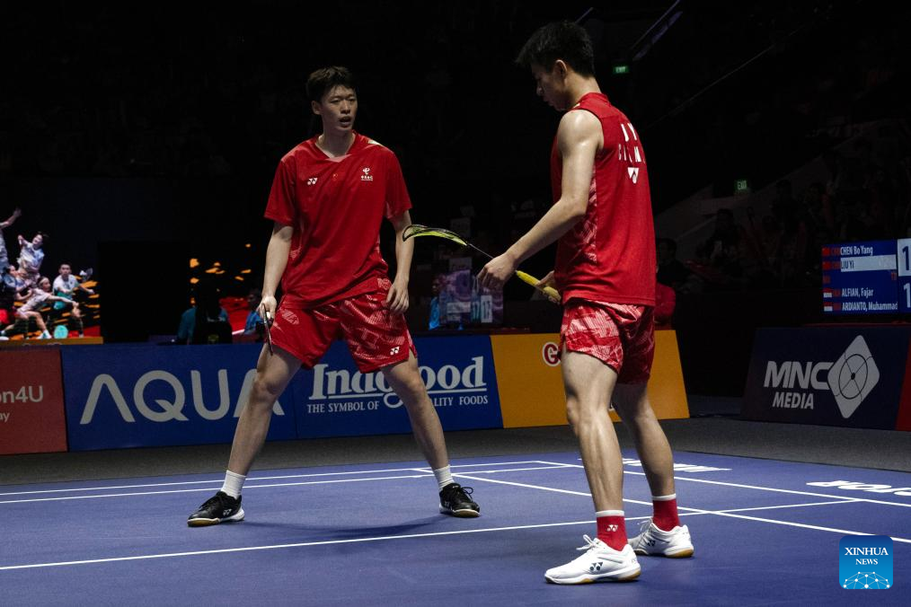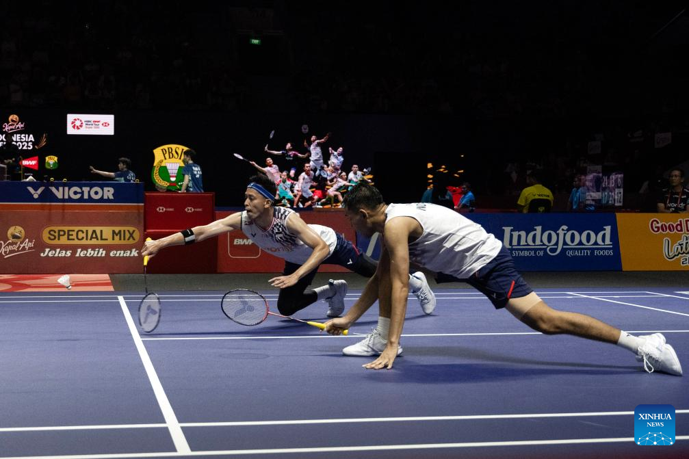 Chen Boyang/Liu Yi (R) compete during the men's doubles round of 16 match between Chen Boyang/Liu Yi of China and Fajar Alfian/Muhammad Rian Ardianto of Indonesia at Indonesia Open 2025 in Jakarta, Indonesia, June 5, 2025. (Xinhua/Veri Sanovri)