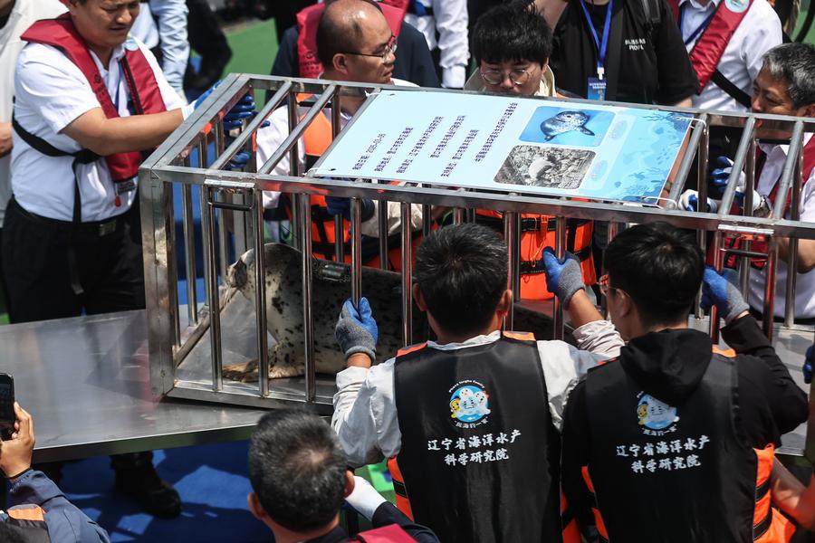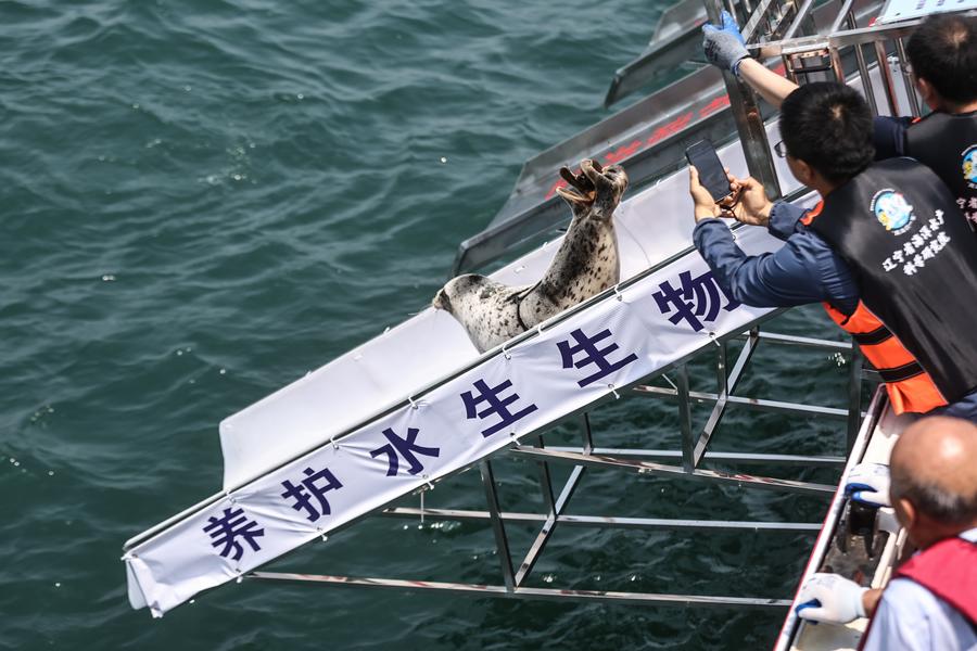 DALIAN, June 6 (Xinhua) -- Nine spotted seals, including 5 pups and 4 adults, were released into waters off the coast of the city of Dalian on Friday.