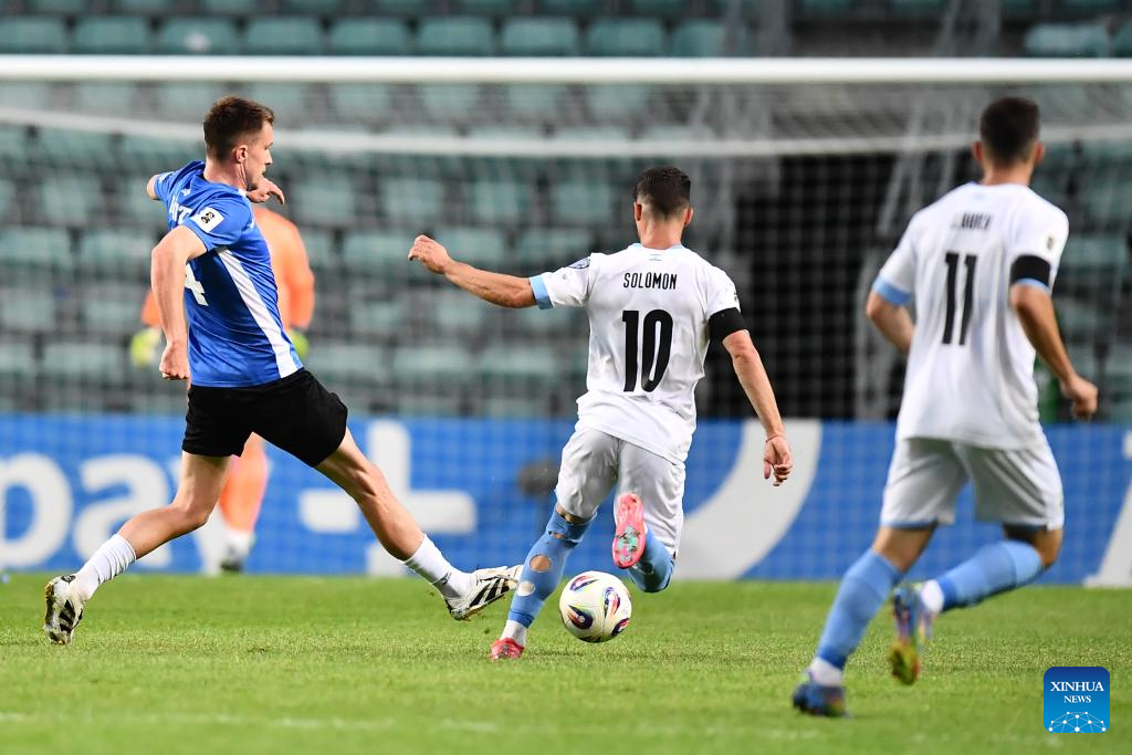 Markus Soomets (L) of Estoniavies with Manor Solomon (C) of Israel during the FIFA World Cup European Qualifiers match between Estonia and Israel at A Le Coq Arena in Tallinn, Estonia, on June 6, 2025 (Photo by Sergei Stepanov/Xinhua)