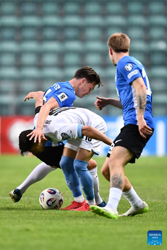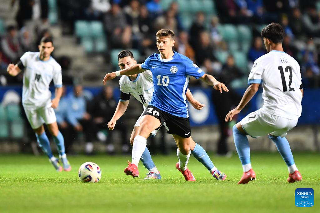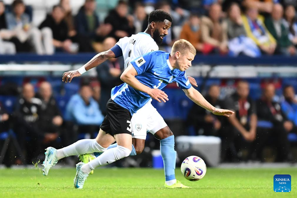 Dimitri Jepihhin (C) of Estonia breaks through during the FIFA World Cup European Qualifiers match between Estonia and Israel at A Le Coq Arena in Tallinn, Estonia, on June 6, 2025 (Photo by Sergei Stepanov/Xinhua)